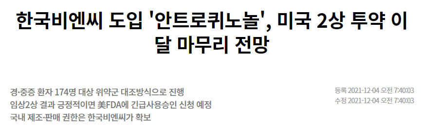 정리하자면 골든바이오텍의 임상2상 실험 성공 및 3상 진행전 FDA 긴급승인 여부가 한국비엔씨 주가에 크게 영향을 미칠 수 밖에 없는 형태로 두 기업의 주가 차트 흐름도 비슷한 방향으로 흘러 갔습니다. 하지만 12월 21일 한국비엔씨를 포함한 경구용 치료제 관련주들이 급하락을 맞이하며 개인투자자들의 판단에 어려움을 가져오고 있습니다.