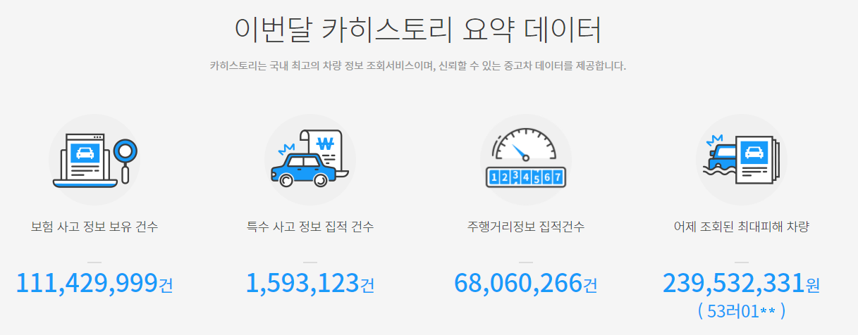 차량번호 또는 차대번호 (차량 고유번호)를 통해서 조회가 가능한데, 자동차 보험으로 처리한 사고 이력이 없다고 하더라도 사고가 여부가 있을 수 있기 때문에 조회해하시기 바랍니다.