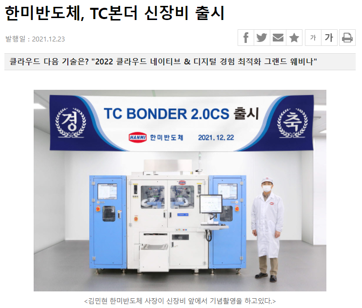 - 12월 23일 한미반도체는 후공정(패키징) 필수 장비인 고성능 TC BONDER 2.0 을 출시