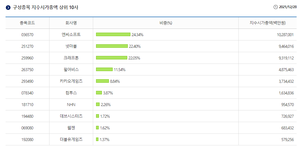 한국거래소에서 운영하는 여러 지수중에 KRX 게임 K-뉴딜지수는 유가증권시장 및 코스닥시장 상장종목 중 게임 산업군내 대표기업 10개 종목을 구성종목으로 하는 지수라고 보면 됩니다.