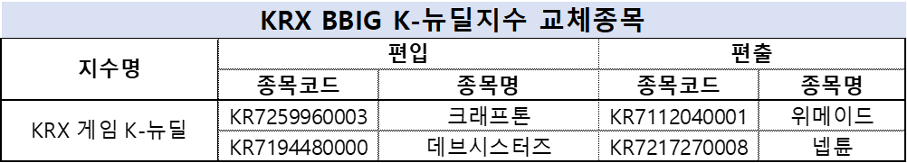 주가의 변동이 이루어지는 만큼 연2회 종목 교체가 이루어지게 됩니다. 게임 K-뉴딜의 경우에도 최근 위메이드와 넵튭이 제외되고 크래프톤과 데브시스터즈가 편입되는 변동이 있었습니다.