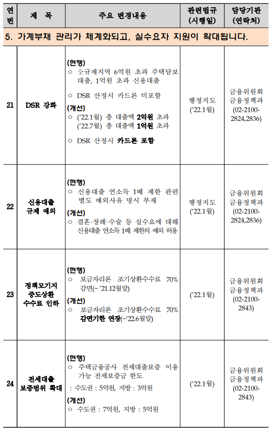 - 결혼, 장례, 수술 등 실수요자에 대해서는 신용대출 연소득 1배 대출제한 규제의 예외로 허용 (2022년 1월)
