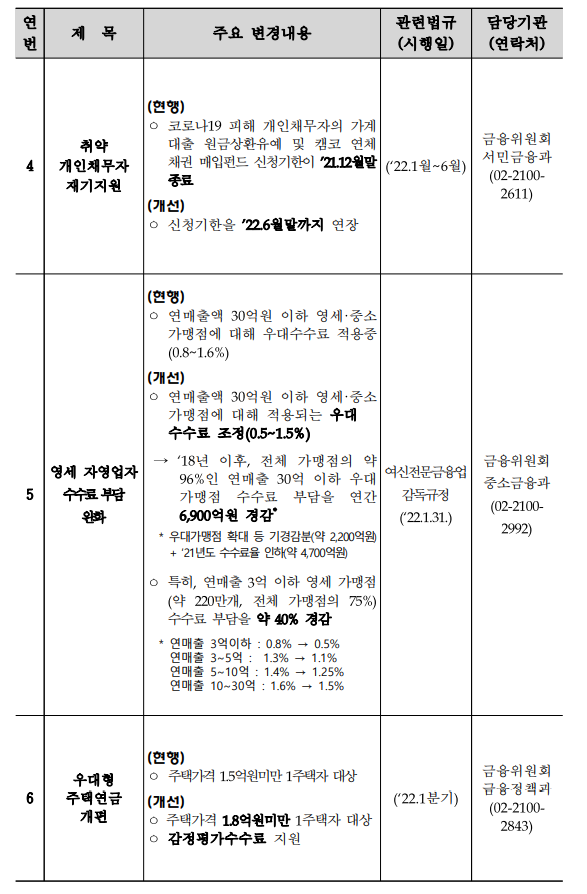 - 프리워크아웃 특례를 통한 가계대출원금상환 유예 및 캠코 개인연체채권 매입펀드 신청기한 연장 (2022년 1월 ~ 2022년 6월)