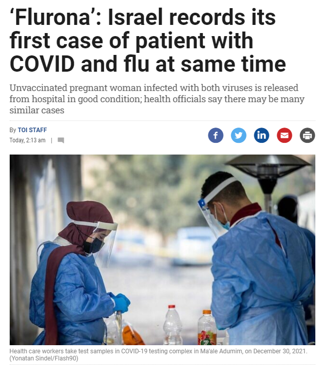이스라엘에서 젊은 임산부가 코로나19와 독감이 동시 양성판정을 받아 감염된 사례가 보고되었다는 공식 발표가 1월 1일에 있었습니다. 현지 언론 및 해외의 주요 외신은 독감과 코로나19 이중 감염을 플루로나(Flurona)라는 이름으로 명명하였는데 이는 독감을 의미하는 인플루엔자(influenza)와 코로나(corona)의 합성어로 해당 케이스는 세계적으로 흔치 않은 것으로 알려졌습니다.