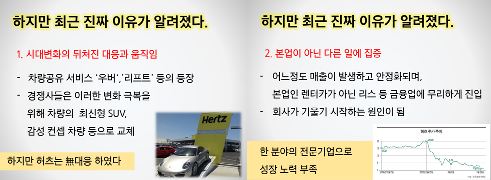 이러한 분석들을 통해 많은 생각을 하게 되었습니다. 어쩌면 굉장히 당연한 이야기이지만, 누군가가 어떤 길을 가겠냐고 물으며 허츠(Hertz)의 행보와 국내렌터카의 행보를 선택지로 준다면 주저 없이 국내렌터카의 손을 들 것 입니다. 하지만 이는 결과를 잘 알고 있기에 쉽게 선택 할 수 있는 문제이지 않을까 하는 생각입니다. 개인사업이든 개인업무를 할 때 과연 내가 허츠(Hertz)처럼 시대에 뒤쳐져 있는 것인지 아니면 흐름에 맞게 나만의 차별화를 이어가고 있는지 제대로 알고있는지요? 안정적이라고 자만하며 본질이 아닌 다른 것에 치중하느라 그 중심이 흔들리고 있는데 그 시그널을 눈치 채지 못하고 있는건 아닌지요? 허츠(Hertz)의 현재 심각한 문제가 해결되기를 기원하며, 이와는 별개로 이 사태로 인하여 알게 된 그 문제의 원인들을 다시 한번 생각하며, 나의 길과 일의 본질을 한번 쯤은 되돌아 볼 수 있는 기회가 되었으면 합니다.
