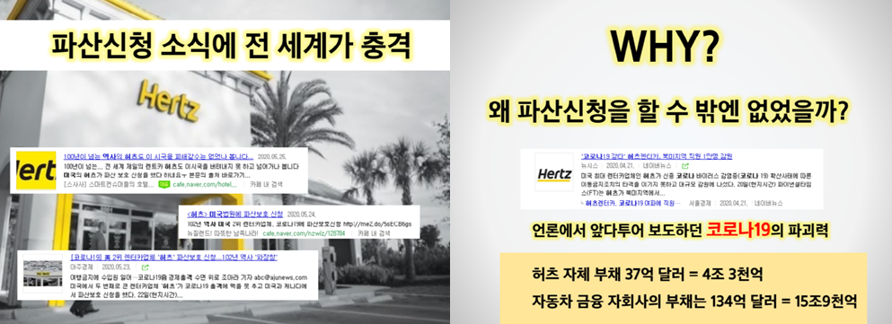 어마어마 한 대기업인 만큼 바로 사라지거나 하진 않겠지만 이 소식만으로도 굉장한 이슈가 되었습니다. 한 기업의 역사가 무려 102년이나 된다니.. 1919년 3.1운동이 있기도 전에 생긴 기업이라면 조금 상상이 될 수 있을진 모르겠습니다. 하지만 왜! 무슨 문제가 있었길래 파신보호신청을 할 수 밖에 없었던 것일까? 그 당시 여러 언론에서 앞다투어 보도한 문제는 역시나 코로나19의 파괴력에 대한 이야기 였습니다. 코로나19로 인하여 외부활동이 급속도로 감소하고, 여행은 거의 불가능 해졌으며, 이에 따라 렌트카 산업도 무너질 수 밖에 없었다고 말입니다. 이로 인하여 원래 많았던 부채는 상상을 초월하는 '조' 단위의 천문학적인 숫자로 번져나갈 수 밖에 없었습니다.