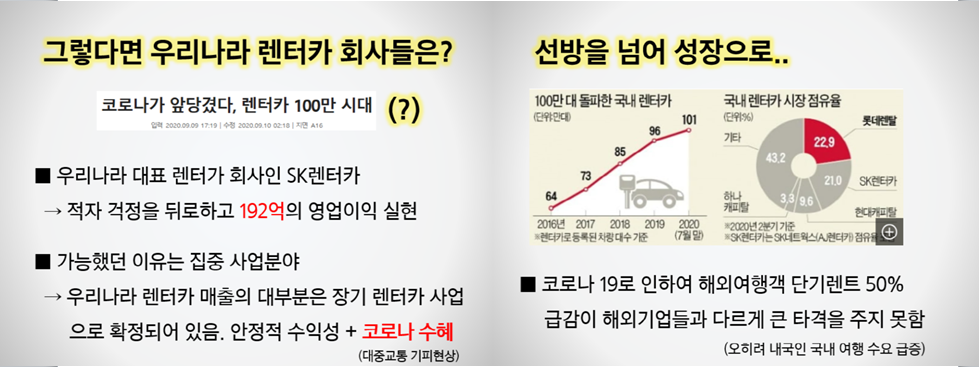 코로나19와 더불어 이런 문제점이 대표 렌터카 회사를 무너뜨린 원인이었다면, 갑작스레 우리나라 렌터카 회사들 역시 어려운 외부 환경 속에서 쉽지 않은 행보를 걸어가고 있겠구나 싶어 검색해본 결과는 더욱 놀랄 수 밖에 없었습니다. 코로나19로 인하여 오히려 성장한 렌터카 회사들의 기사들.. 시장 점유율 1위인 SK렌터카의 경우 모두가 여행 관련 기업들의 적자 걱정을 하고 있을 때 분기 192억의 영업 이익을 실현했다는 기사는 충격적이었습니다. 그 이유는 우리나라의 렌터카 회사의 수익 90% 수준은 장기 렌터카 사업에서 나왔기 때문이었습니다. 어느정도 안정적인 매출 구조를 가지고 있는 상황에 닥쳐온 코로나19는 오히려 대중교통을 기피하는 현상으로 인하여 개인차량들을 준비 하기 시작하였고, 부담되는 차량 구매 보다는 장기 렌트를 찾는 고객이 많았다는 분석이었습니다. 무너져가는 하츠(Hertz)와는 정반대의 길을 가고 있었고 그 원인은 각 회사의 방향에 있었습니다.