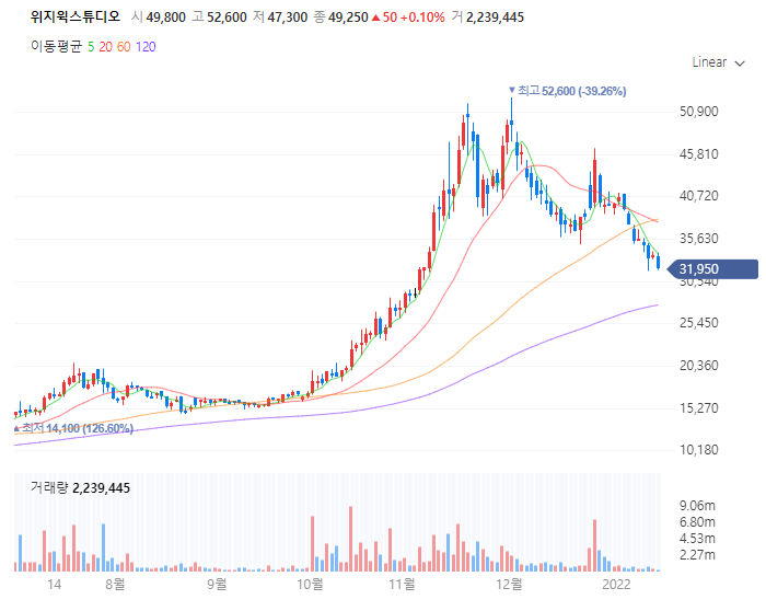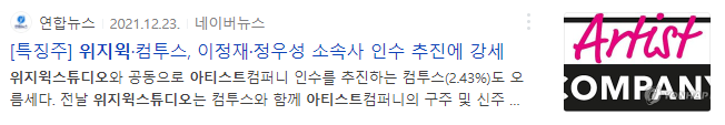 - 작년 컴투스와 위지윅스튜디오는 함께 아티스트컴퍼니 인수 추진 소식에 항상 강세