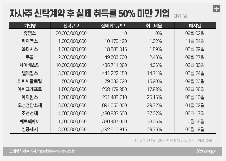 실제 작년 기사에서 자사주매입 신탁계약 후 실제로 취득률 50% 미만으로 해지가 이루어진 케이스가 굉장히 많다는 내용의 기사입니다. 그만큼 이러한 리스크도 있음을 확인하시어 투자에 참고하시길 바라겠습니다.