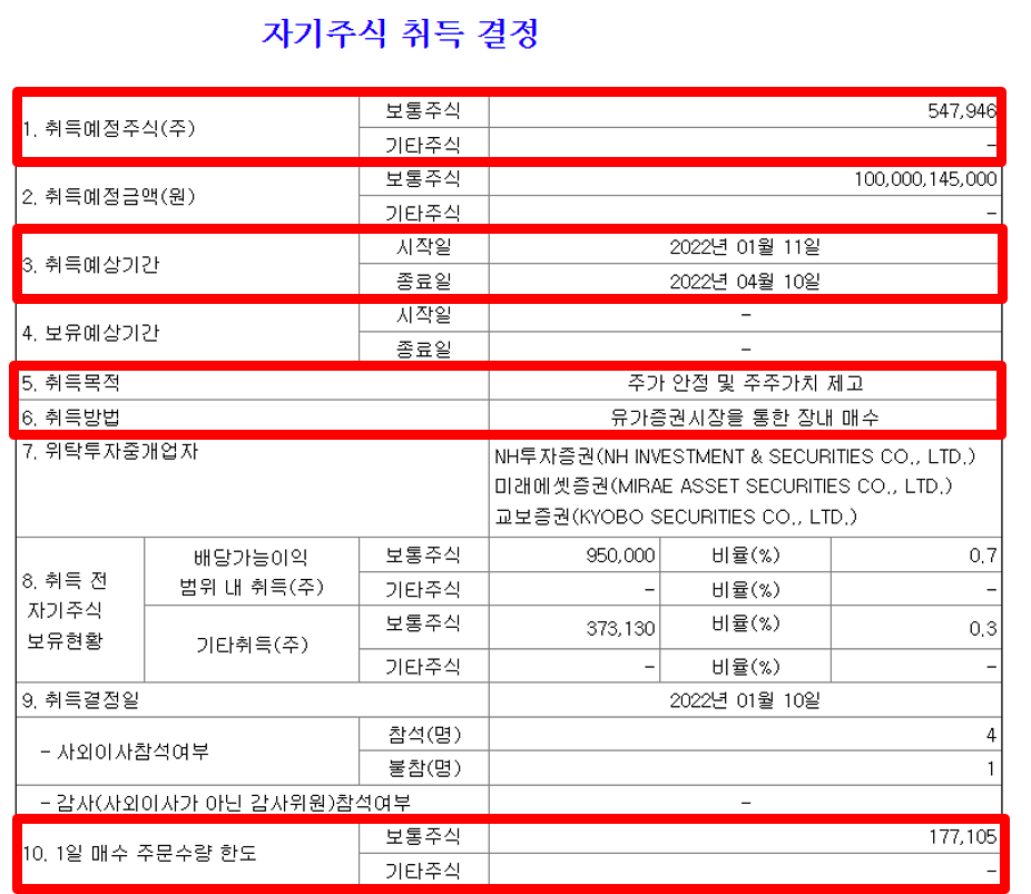 1,2) 취득예정주식/금액 : 몇주를 취득하기로 결정했는지 금액은 얼마인지 확인 가능 (클 수록 시장 반응 당연히 큼)