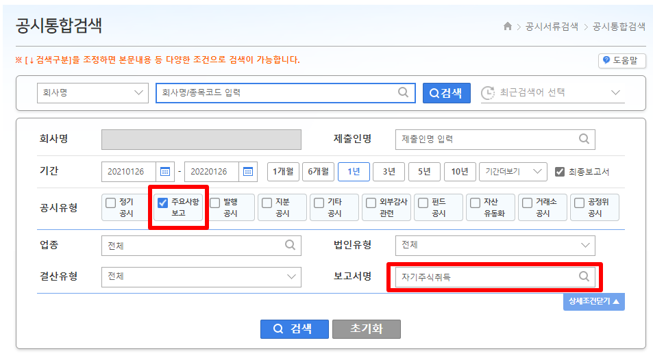 2) 기업명 없이 상세조건에 '자기주식취득' 검색어로 입력하여 검색