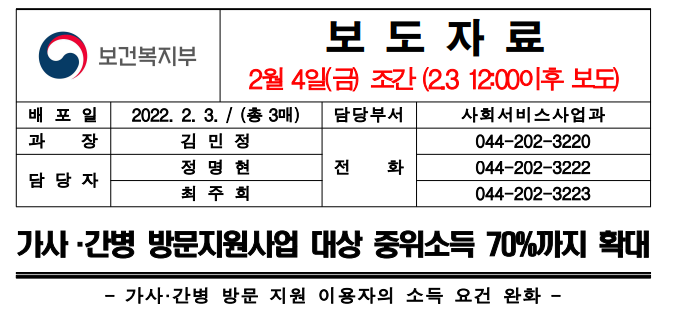 이 기준이 중위소득 70%까지로 가사, 간병 방문서비스 대상자의 소득요건을 이달(22년 2월) 부터 완화하는 내용이 주요 내용입니다. 이러한 완화 내용으로 만 65세 미만이면서 중위소득 70% 이하에 해당하는 중증장애인, 6개월 이상 치료를 요하는 중증질환자, 희귀난치성질환자, 소년소녀가정/조손가정/한부모가정 등은 지원을 받을 수 있게 되었습니다.