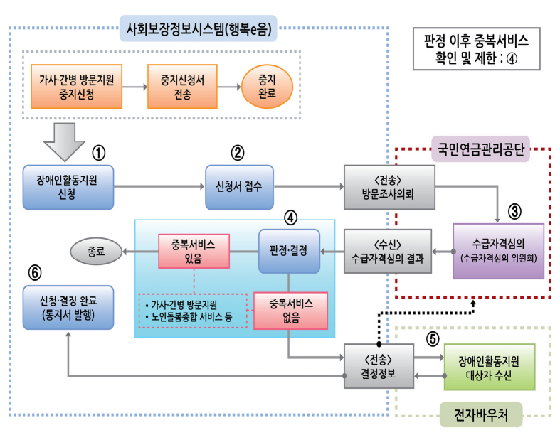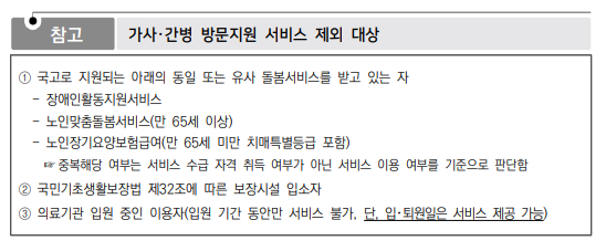 - 만 65세 미만의 기준 중위소득 70% 이하 계층 중 아래 6가지에 해당하는 사람으로 가사, 간병 서비스가 필요한 자