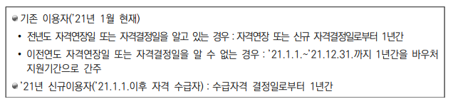 - 장기입원 사례 관리 퇴원자 : 자격 결정일로부터 1년 (이후 연장 불가)