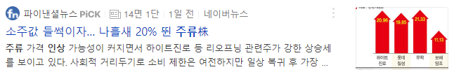이러한 소식에 주가는 즉각적으로 반응하고 있습니다. 소주값이 인상할 가능성이 높다는 카더라 소식만으로도 주류 업체들은 4일 동안 큰 상승을 보여주었습니다. 하이트진로는 20.1%, 롯데칠성 19.8%, 무학 21.3%, 보해 11.1% 등 어려운 장세 속에서도 큰 상승을 이어가고 있습니다. 조금은 의아한 생각이 들 수 도 있습니다. 가격을 올린다는데 주가가 왜 오르지? 하는 생각등이 들 수 있습니다만 사실 이는 어쩌면 당연한 결과라고 볼 수도 있습니다. 아래 자세히 다뤄보겠습니다.