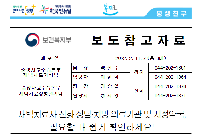 이러한 현 상황에서 보건복지부는 2월 11일 보도자료를 통하여 재택치료자들이 치료과정, 행동지침 등 상담이 필요한 부분에 대한 지원이라던지 처방을 받을 수 있는 의료기관 및 지정약국에 대한 리스트를 공개하며 재택치료자들의 지원을 위하여 움직이고 있음을 알렸습니다.