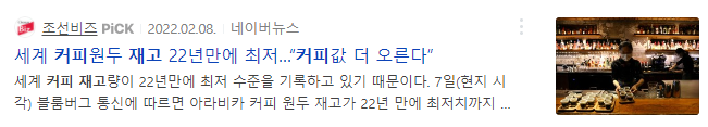 커피값이 수년만에 최고치를 기록할 것이라는 이야기는 그냥 나온 소문이 아닙니다. 세계 커피 재고량이 22년만에 최저 수준을 기록하고 있기 때문입니다. 2월 초 블룸버그 통신에 따르면 아라비카 커피 원두 재고가 22년만에 최저치를 찍었고 수요가 줄고 있지 않은 상황에서 가격 상승은 당연한 것으로 보여집니다.