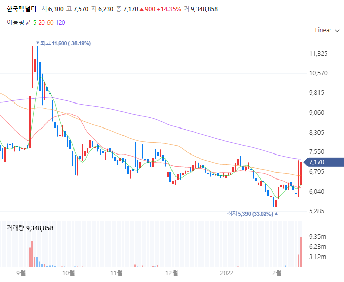 이러한 사회 현상에 따라 국내 증시에서는 한국맥널티가 가장 큰 반응을 보이고 있습니다. 한국맥널티는 원두커피 제조, 가공 사업을 주력으로 하고 있는 업체입니다. 커피와 관련된 모든 제품의 생산을 하고 있는 만큼 가장 큰 영향을 받을 종목으로 부각되며 2월 16일 당일 +14.35% 를 기록하며 오랜 조정 끝에 이틀 연속 크게 상승하는 모습을 보이고 있습니다.