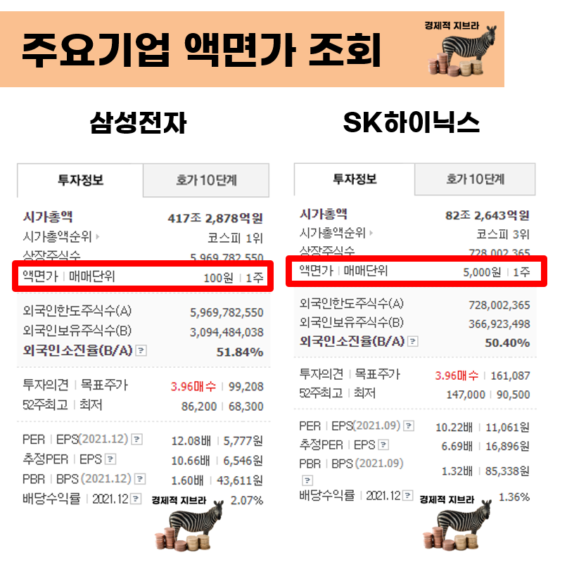 - 액면가는 네이버, 증권사 등 기업 주요 정보에 명기