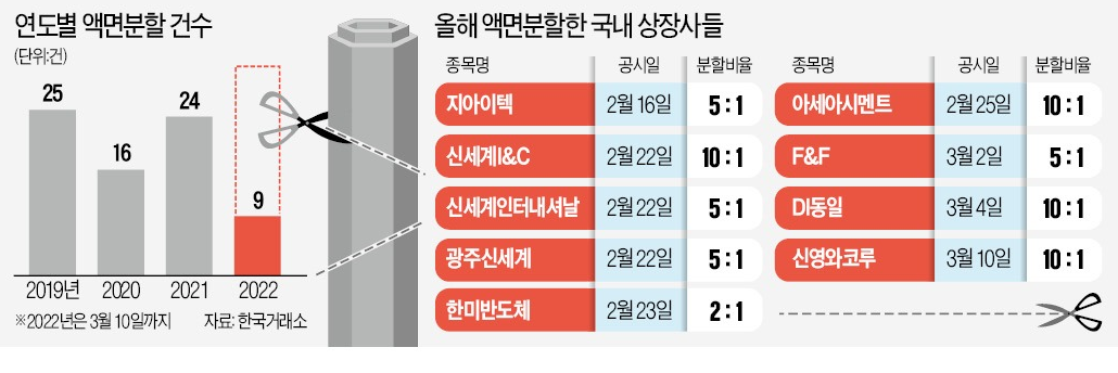 - 주식의 액면가액을 일정한 분할 비율로 나눔으로써 주식수를 증가시키는 일
