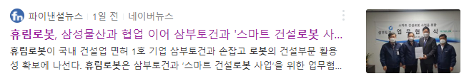 - 최근 삼성물산에 이어 삼부토건과 스마트 건설로봇 사업을 위한 MOU 체결