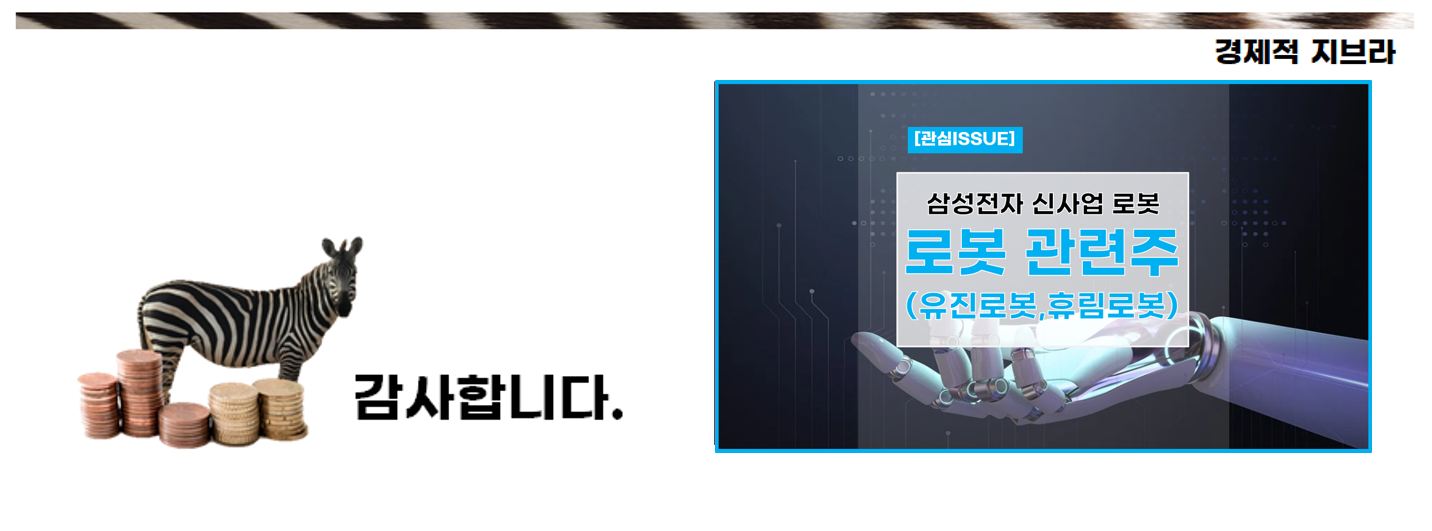 이날 한종희 대표이사 부회장은 신성장 동력으로 로봇과 메타버스 사업을 추진하겠다고 밝히며 전문조직을 강화하여 로봇을 신사업으로 추진하고 있다고 말했습니다. 이미 삼성전자는 2020년말 조직개편을 통하여 로봇사업화 전담팀(TF)를 신설하고 사업 가능성을 따져본 결과 2021년말 조직개편에서는 로봇사업팀으로 격상시킨 이력이 있습니다. 본격적인 로봇상품을 통한 사업을 하겠다는 해석으로 21년말과 22년초에 로봇관련주들이 한번 들썩인 이력이 있습니다.