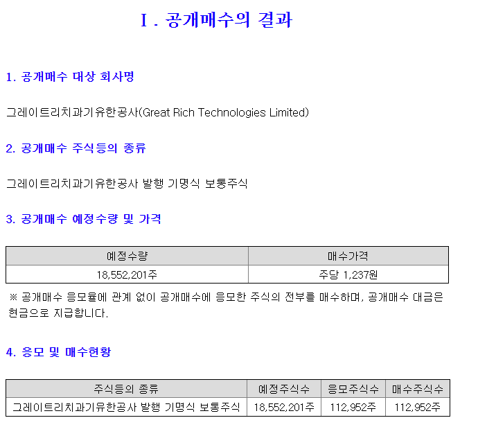 이렇게 주식공개매수를 통해 지분율을 높이기 위해 올해 초와 4월에 공개매수를 통해서 지분을 확보하고자 노력하고 있습니다만 쉽게 이루어지지 않고 있습니다. 이번 공개매수에서도 목표의 0.6% 밖에 달성하지 못하며 기존 72.46% 였던 지분율이 72.63% 수준으로 소폭 상승하게 되었으며 앞으로도 쉽지 않을 것으로 보여집니다. (아래 공시 이미지 참고)
