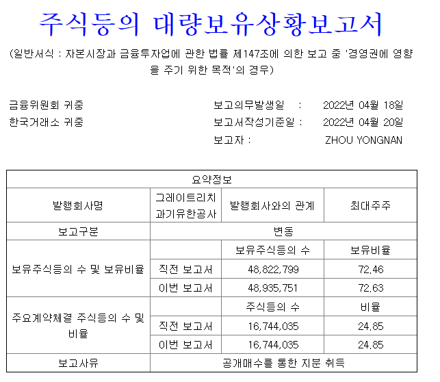 GRT가 이러한 차익을 얻고 철수(먹튀?)에 성공하기 위해서는 최대주주가 회사 지분의 95%를 보유해야만 합니다.