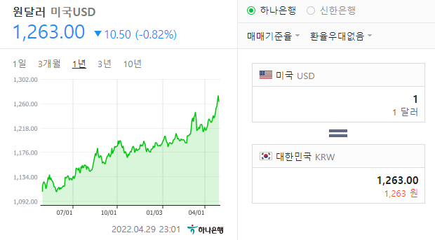최근 처럼 환율이 1,263원 가까이 지속 상승하고 있는 시점에서는 투자자금 회수가 많아 외국인 매도세가 강한 이유입니다.