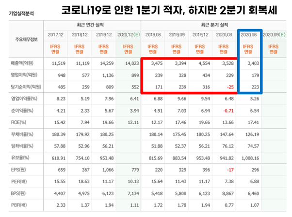 기본적으로 현재의 매출실적과 앞으로의 실적에 대한 기대감이 없었으면 기업을 분석하지도 않았을 가장 중요한 부분입니다. `20년 1Q 적자 이후 2Q에는 작년 수준의 당기순이익을 기록하며 코로나19의 충격을 딛고 어느정도 회복을 하였고 지속될 것으로 보여집니다. 물론 아직 코로나19가 지속되고 있고 일정기간 동안 쌓인 재고등으로 인한 변수가 있겠지만 그럼에도 지속적인 회복해 나아가고 있는 모습을 보여줄 것으로 판단됩니다.