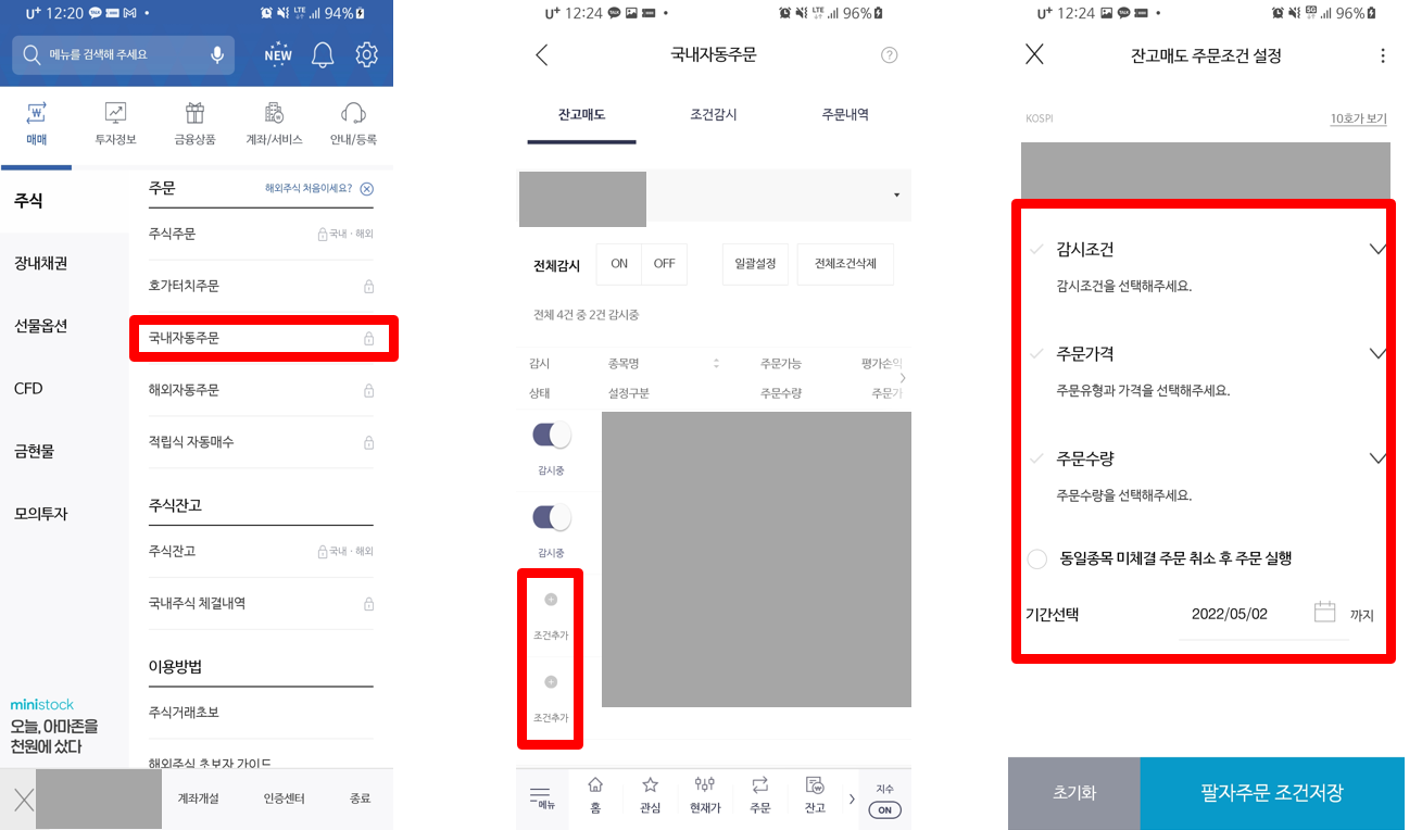 - 만약 자동 주문 설정 후 정규장에서 다른 주문을 넣어두게 되면 조건이 달성되더라도 자동 주문 실패 (주문 수량이 없음)