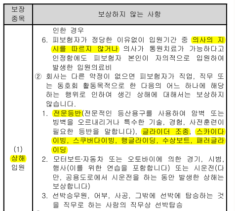 스포츠보험 또는 레져보험 이라할지라도 모든 활동에 대한 보장이 되는 것이 아닙니다. 결국 내가 주로하고자하는 등산, 레져, 스포츠 종류가 해당 보험에서 보장을 받을 수 있는 것인지에 대한 부분도 반드시 확인이 필요합니다.