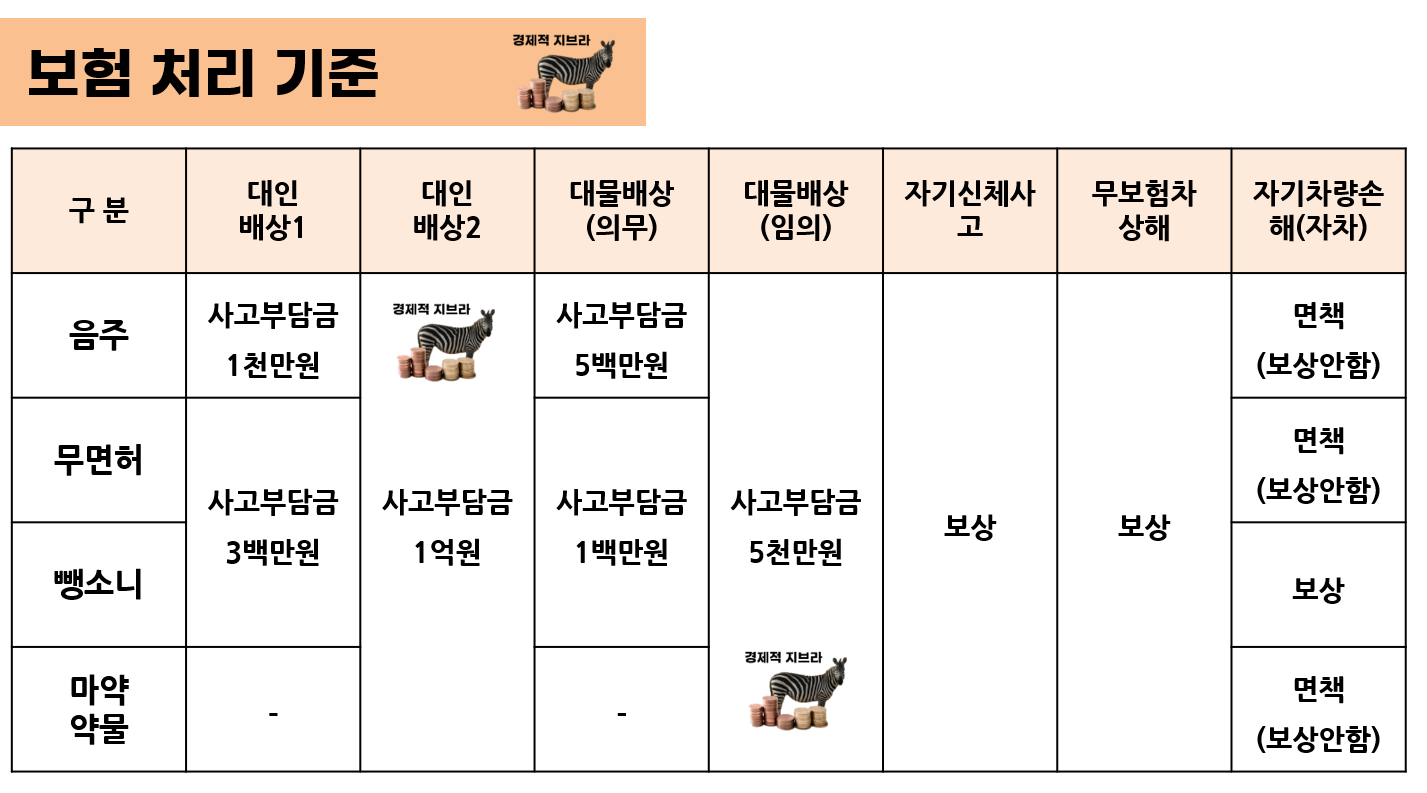- 종합보험 가입을 하고 있더라도 대인사고 1,000만원 / 대물사고 500만원 자기부담금 발생