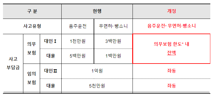 - 대인 & 대물 음주운전 사고 발생시 7월 28일 부터는 의무보험 한도내 전액 보상이 불가