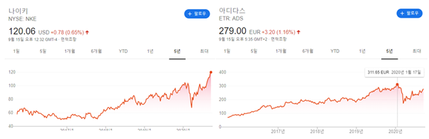 스포츠 의류 브랜드 시장은 점차 대형화 되어가고 소형 브랜드들은 대형 브랜드에 흡수되는 형태로 진행되어지고 있습니다. 현재 세계 1,2위를 차지하고 있는 탄탄한 두 기업의 주문은 큰 문제나 사고가 터지지 않는 이상 화승인더를 든든하게 받쳐줄 수 밖에 없는 구조입니다. 그렇다면 나이키와 아디다스의 상황은 어떠한지가 굉장히 중요한 요소로 작용할 텐데, 현재 나이키는 신고가를 기록하며 역대 최고의 주가흐름을 보여주고 있으며, 아디다스 역시 코로나19 사태 이전의 흐름으로 회복중이며 신고가를 도전하고 있는 좋은 상황입니다. 이러한 흐름 역시 화승인더에게는 굉장히 큰 호재이며, 향후 흐름을 기대하게 만드는 요소입니다.
