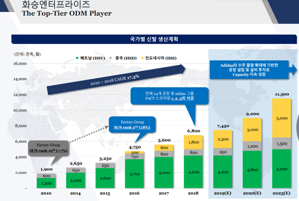 미국 기업들의 탈중국화 가속화가 현재 시점에도 가속화되고 있으며, 이에 따라 반사이익을 보는 우리나라 기업들이 생겨 나고 있습니다. 화승인더 역시 이에 조금은 영향을 받지 않을까 하는 기대감들이 많이 생긴 것이 사실입니다. 지속적으로 아디다스 벤더 업체 내에서 M/S가 상승하며 `16년 13% 였던 수준이 20% 수준으로 보여지고 있습니다. 1위업체인 대만의 ‘파우첸’의 경우 25% 수준의 M/S를 보유 하고 있고, 그 뒤로 화승인더가 2위로 주요 벤더로써 성장한 모습으로 보여집니다. 그 이유로는 작년 9월 3위 업체인 ‘칭루’의 계약이 종료되며 경쟁사 수주량이 화승인더로 많이 유입되었기 때문이라는 내부 발표가 가장 크다고 보여집니다.