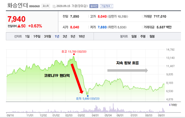 ‘화승인더’ (화승인더스트리) 이름만 들어도 ‘르까프’의 회사로 많은 분들이 알고 계실 거라 생각되는 회사입니다. 현재 기본적으로 아디다스 신발을 ODM, OEM하는 회사로써 2017년부터 코로나19 이슈가 있기 직전인 19년까지 지속적인 성장을 해온 것을 재무재표를 통해서 알 수 있습니다. 하지만 코로나19가 터지면서 전반적인 제조업의 흐름과 동일하게 매출 및 영업이익이 하락하였고 `20년 1Q의 영업이익은 적자를 기록하게 됩니다. 이에 따라 주가는 급락을 맞이하게 되었지만 2Q의 실적이 어느 정도 회복되었음에도 이상할 만큼 주가는 아직 코로나 이전으로의 회복은 커녕 하락과 횡보를 반복하고 있는 상황입니다. 그 이유와 앞으로의 흐름을 아래 5가지 이유를 통해 예측해보겠습니다.