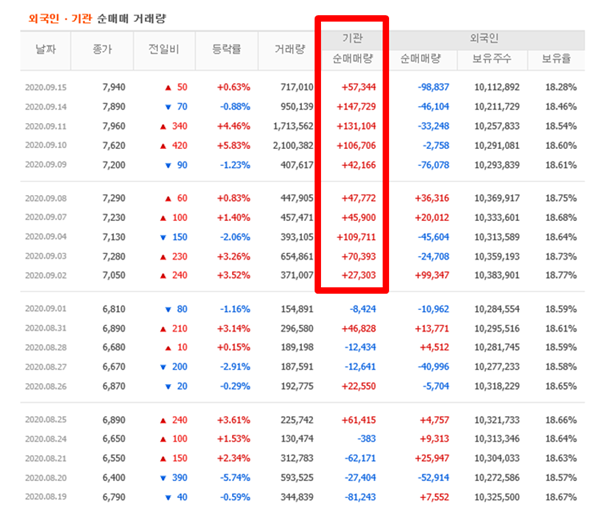 위에서 보여진 1,2번의 좋은 호재에도 불구하고 화승인더의 주가는 크게 변화가 없어왔습니다. 코로나19 사태의 3월부터 지속적으로 기관의 매도가 이루어졌고, 아직도 더 매도할 물량이 남았나 싶을 정도의 거래 흐름에 개인과 외국인의 매수세가 있는 날에도 큰 반등을 보여주기는 역부족이었습니다. 하지만 최근 기관의 움직임이 심상치 않은 것이 보여지고 있습니다. 9월 들어서자마자 시작된 9월 15일 기준 10영업일 연속 순매수. 이 흐름이 태양전지필름 테마 때문의 흐름인지, 기업가치를 인정받은 기관들의 매수인지는 아직 판단하기 어렵지만 이로 인하여 시장의 관심을 받기 시작했다는 사실만으로도 충분히 영향이 있을 것으로 판단됩니다.