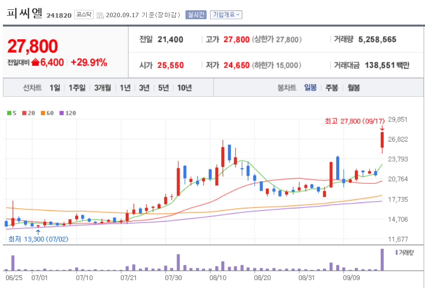 투자 매력도가 매우 높은 피씨엘이라는 기업의 분석을 진행하고 데이터를 모으며 금주 내 관심종목으로 주말 최종 포스팅을 해야지 하며 준비하고 있는 와중에 금일 (9/18) 피씨엘이 사고를 치고 말았습니다. '가정용 코로나19 항체 신속진단기기' 미국 출시를 준비한다는 소식과 함께 시장의 엄청난 반응을 이끌어내며 금일 상한가(+29.91%) 불기둥을 뿜으며 마감하였습니다. 개인적으로 보유 중이기는 했지만 2만원 미만으로 비중을 더 담기 위해 준비중이었던 기업이었던 만큼 아쉬운 타이밍이었던 것 같습니다. 하지만 이 가정용 코로나기기 때문에 비중을 담으려 했던 것은 아닙니다. 그만큼 작지만 투자매력도가 높다고 판단되었기 때문이었고 아래 최대한 객관적인 팩트 위주의 이유를 정리하여 공유드리고자 합니다.
