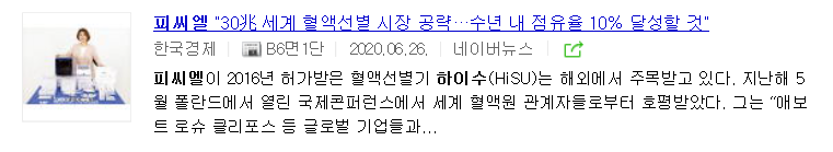 또한 혈액선별기 시장에서 인정받은 피씨엘의 (HiSU)는 혈액을 통해 동시에 에이즈, B/C형 간염, 매독, T세포 백혈병 등 5가지 질병을 동시에 검사 가능하며 타 경쟁 제품에 비하여 값싼 진단 시약과 동시 대량 검사가 가능한 부분으로 한국, 독일에서 세계 최초로 허가를 받은 제품이다. 현재 여러 나라에서도 허가절차를 밟고 있으며 국책과제와도 연결되어 관심이 매우 높은 분야입니다. 혈액선별시장의 규모는 대략 연간 30조가 넘는 규모로써 점유율 10% 이상을 목표로 (Abott M/S 75%) 움직이고 있으며, 기기 납품을 통해 전용시약을 독점 공급하는 만큼 큰 매출을 기대할 수 있는 분야이기도 합니다.