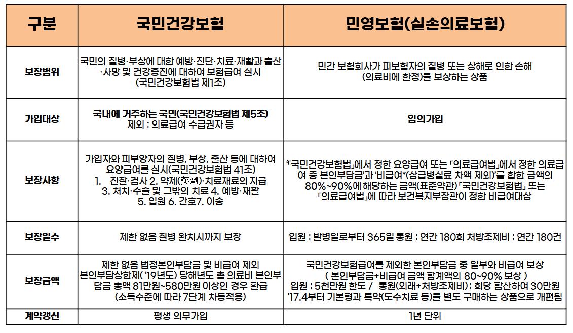 이름부터 느낌이 비슷하여 헷갈리는 이 두가지는 기본적으로 국민들의 과도한 의료비 지출을 지원하기 위함에서 동일한 성격을 지니고는 있지만 운영주체부터, 지급 기준까지 완전히 다른 제도라고 봐야합니다. 예를 들어 자기부담금 한도는 실손의료비 가입자가 아니라면 아예 대상이 되지 않습니다. 이 두가지 제도를 이해하기 위해서는 기본적으로 우리나라의 의료 시스템을 간략하게나마 이해하고 있으면 좋습니다. 현재 우리나라는 국가에서 운영하는 국민건강보험과 민영보험이 균형을 이루며 제도가 결정되고 있습니다.