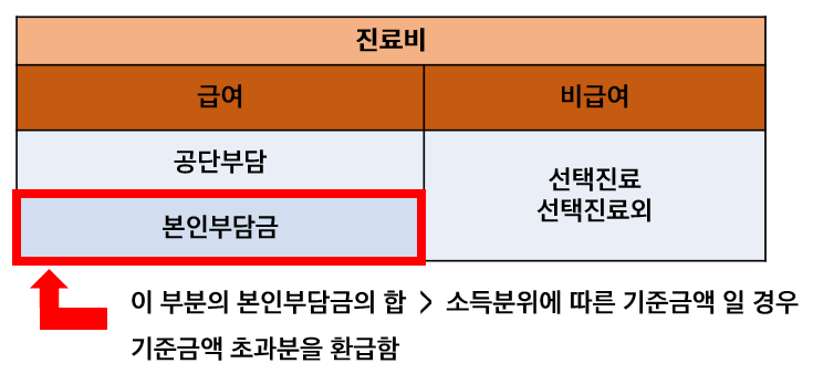 쉽게 단순한 예를 들자면 고소득자로 10분위에 해당하는 사람 (소득기준 10%씩 끊은 기준에서 최상단)이 심각한 뇌출혈로 인하여 입원 치료를 받았다고 가정해보겠습니다. 진료비 영수증을 보니 총 3천만원의 치료비가 발생 [급여부분 2,000만원 (공단부담 1,000만원 + 본인부담금 1,000만원)] + [비급여 1,000만원]이 찍혔다고 가정했을 때 급여부분의 본인부담금 (1,000만원) 이 10분위의 기준금액인 582만원을 초과하기 때문에 그 차액인 418만원은 환급을 받는 제도라고 생각하면 됩니다. 이를 지원받는 방식은 건강보험공단에서 급여 치료비의 합산 금액이 개인의 소득분위에 맞는 상한액을 초과했을 때 초과금액을 환급하여 줍니다. 이를 그림으로 표현하면 이렇습니다.