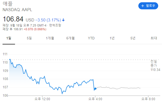 이번 트럼프 행정부의 조치는 미국 내에서 생활하고 있는 중국인들과 유학생들의 위챗 사용마저 차단하게 되는 영향을 노린것 이기 때문에 영향은 무시하지 못할 수준입니다. 이번 조치로 인하여 미국에 본사를 두고 있는 애플이 앱스토어에서 위챗 앱을 삭제할 수 밖에 없게 됩니다. 그렇기에 위챗을 애플에서 사용하지 못한다고 하면 반사적으로 위챗의 사용이 습관화되고 생활화되어 있는 수많은 사용자들은 위챗을 떠나는 것이 아니라 애플의 아이폰을 떠나는 사람도 많을 것이라는 예측도 나오고 있습니다. 미국 뿐만 아니라 중국시장에서의 아이폰 판매량은 애플에게 있어서 엄청난 규모의 이익을 가져다주는 시장인 만큼 판매량의 감소는 기업에 큰 타격을 줄 수밖에 없을 것입니다. 애플의 주가는 9월 1일 신고가 갱신 이후 지속하락하며 반등을 노리고 있지만 이런 예측이 영향을 줘서인지 금일 -3.50% 하락하며 나스닥 -1.07% 에 비하여 큰 하락 폭으로 정규장 마감을 하였습니다.