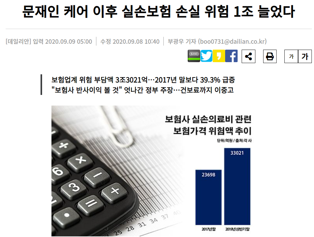 그 당시 문재인 케어로 인하여 민영보험사들은 반사이익을 볼 것이라고 예측하며 정부는 주장해왔지만 3년이 지난 현재 시점에서는 정반대의 결과가 나오고 있다는 것이 충격입니다. 기사에 따르면 올 상반기 40개의 보험사가 운영중인 실손의료보험의 추산 보험가격 위험액은 3조 3021억원으로 문재인 케어 직전보다 무려 39.3% 증가하였다고 발표하였다. 보험가격 위험액이란 보험회사에서 지급될 보험금을 예측하여 계산하여 고객들로 부터 받은 보험료 대비 지급하는 보험금이 많을 경우의 손실액을 이야기합니다.