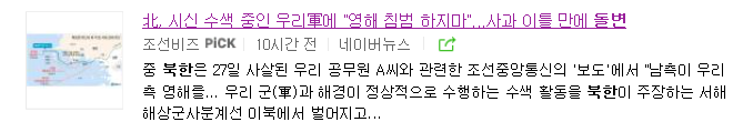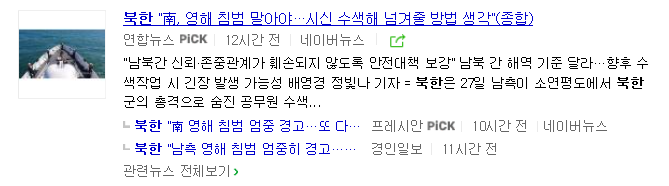 금일 (27일) 남측이 소연평도에서 북한군의 총격으로 숨진 공무원의 수색 작업 도중 북측 영해를 침범하고 있다며 중단하라는 강한 경고의 메세지를 전달했다는 소식이 주요 뉴스로 올라와 있습니다. 북한은 금일 (27일) 조선중앙 통신의 보도를 통해 '남조선 당국에 경고한다' 라는 제목으로 서해 해상군사분계선 무단 침범 행위를 즉시 중단할 것을 요구하였습니다. 현재 NLL 부근 연평도 서방에서 부터 소청도 남방 해상을 8개 구역으로 나누어서 함정 등 39척의 배와 항공기 6대를 투입하여 수색 작업을 벌이고 있습니다. 그리고 군 관계자는 현재 해상수색활동은 정상적으로 진행되고 있으며 NLL 부근 중국 어선 수십여척이 조업중인 것 조차 통제하는 활동도 같이하고 있어서 그 누구도 남측 수역을 벗어 나지 않고 있다는 입장을 보이고 있습니다.