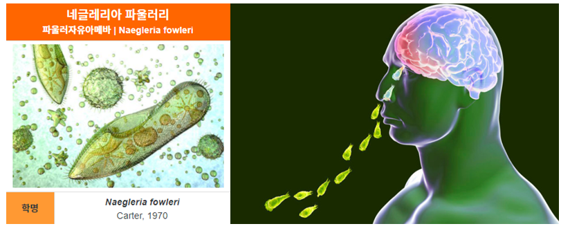 일명 '뇌 먹는 아메바' 라는 별명을 가진 네글레리라 파울러리는 21세기 들어서면서 발견돈 희귀병 중 하나이며, 무려98.5%의 치사율로 어마무시한 병으로 전 세계의 감염자 중에서 단 12명만이 생존 할 수 있었던 무서운 질병입니다. 주로 민물이나 토양에서 흔히 발견되는 생물로, 주로 연못, 호수, 하천 등의 25°C 이상의 따뜻한 물에서 수영하거나 코세척 등으로 코에 물이 들어가면 따라 들어가 아주 드물게 점막을 통과해 뇌척수액으로 침투하여 원발성 아메바성 수막뇌염(primary amoebic meningoencephalitis)을 일으킨다고 알려져 있습니다.