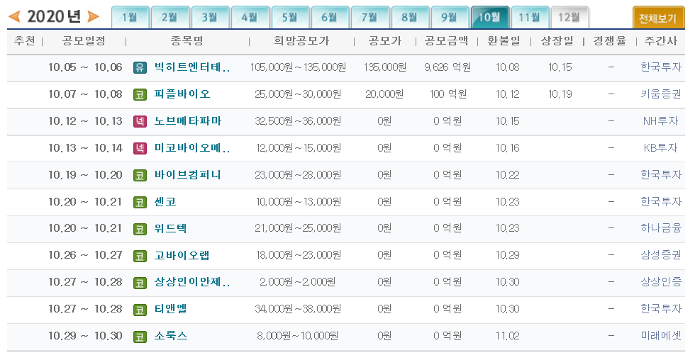 10월에는 대략 11개 기업의 공모주 청약일정이 예정되어 있습니다. 그 중 가장 큰 관심을 보이는 빅히트엔터테인먼트와 이어서 8일 진행되는 피플바이오 이 두가지 종목만이 공모가가 확정되어 있는 상태입니다. 당장 다음주 월요일 (5일) 부터 진행되는 빅히트엔터테인먼트의 주관사는 한국투자증권으로 월요일 서버이상 문제가 걱정되지만 카카오게임즈에 이어서 IPO를 통한 엄청난 자금 유입으로 큰 이득을 보고 있는 상황에 10월에도 무려 4개의 메인주관사로 IPO 진행이 됩니다. IPO에 관심이 많으신 분들은 관심 종목들이 앞으로 주관사가 다를 예정이기에 미리미리 계좌 하나씩을 생성해 두시길 바랍니다. (20영업일 이내 신규 계좌개설 제한)