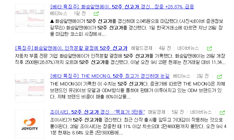 이렇게 예민하다보니 단기투자자들은 52주 신고가 종목들만을 골라서 신고가 달성 이후 눌림자리를 찾아 짧게 매매를 하는 기법과 투자자도 상당히 존재할 정도로 중요 포인트로 생각을 하게 됩니다. 하지만 장기투자자 입장에서는 조금 다르게 해석해야 할 필요가 있습니다. 당장의 신고가 돌파에 눌림자리를 찾아 매수하는 단기 투자가 아닌 만큼 현재 신고가를 기록하고 있는 종목들의 업황을 파악하여 현재 이슈가 되고 관심이 쏠리고 있구나라는 분석이 가능하며, 동일 업종 이나 테마 내에서 추후 상승 여력이 있는 기타 종목들을 분석하는 용으로 활용할 수 있습니다. 이러한 업황과 호재에 대한 분석 없이 매일 같이 몇십개의 종목이 기록하는 신고가 종목을 덥석 물었다간 장기적으로 고통스러운 날들을 보낼 가능성도 높은 만큼 신중한 판단이 필요합니다.