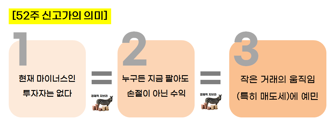 당연한 이야기지만 해당 종목이 신고가다 라는 의미는 다른말로 현재 이 종목을 보유하고 있는 중에 손해를 보거나 마이너스인 사람은 없다. 라는 뜻이기도 합니다. 그렇기 때문에 작은 거래의 움직임에도 굉장히 예민하게 반응할 수 밖에 없는 상태에 돌입했다는 뜻이기도 합니다. 한마디로 장기투자자를 제외한 많은 투자자들이 언제든 팔아도 되는 상태에 놓여 있기 때문에 앞으로의 작은 움직임에도 대량 매도세가 쏟아지기도 한다는 의미입니다.