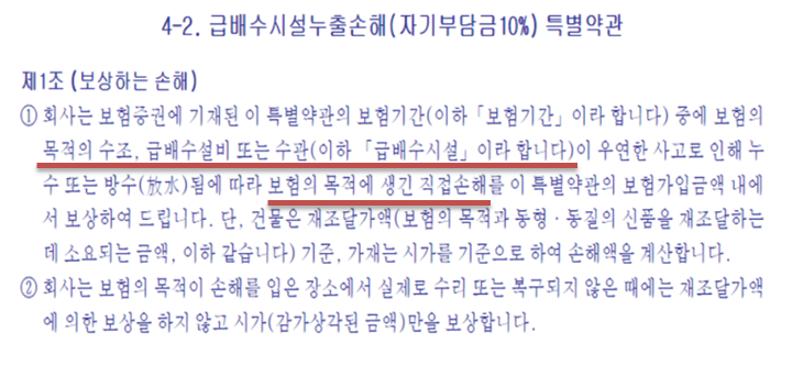 담보 이름 그대로 일상생활을 하는 중 누군가에게 배상을 할 일이 생길 때 보상을 받을 수 있는 담보입니다. 가장 먼저 찾아야하는 담보이기도 하고, 나도 모르게 많은 사람들이 가입되어져 있는 담보이기 때문입니다. 개인보험을 종합적으로 가입한 분이라면 아마 대부분 해당 담보가 가입되어져 있는 걸 보실 수 있으실텐데, 저렴한 보험료에도 잘 몰라서 혜택을 못받을 뿐이지 엄청난 역할을 할 수도 있는 담보입니다. 대부분의 약관 정의에는 우연한 사고로 대인배상 또는 대물배상책임을 부담함으로써 입은 손해를 보상합니다. 라고 명기되어 있습니다. 물론 고의라던지 천재지변 등은 면책 (회사별 상이)이지만 여기서 다루고자하는 누수 손해는 면책에 해당되지 않기 때문에 내가 피해를 입힌 부분은 대물배상으로 자기부담금 일부를 제외하고 보상이 가능합니다.